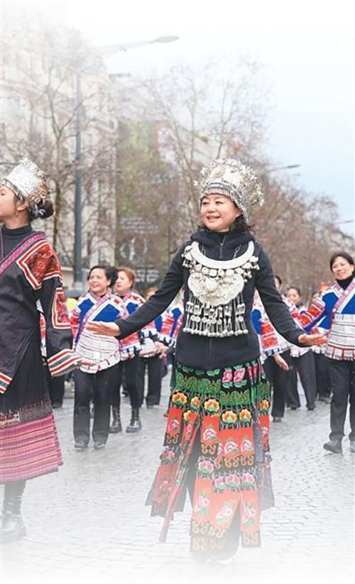 张竹身着贵州少数民族服装,在法国巴黎参加春节巡游活动。
