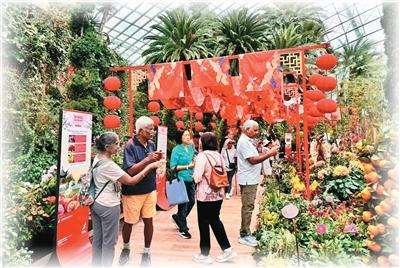 丙午马年春节,新加坡滨海湾花园“春花盛开之骏马奔腾”花展,游客欣赏“帆影花廊”一景。上海建工园林集团供图