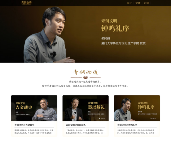 除五大交互网页外,特展还包含《青铜论道》、《金牌讲解说青铜》系列视频,兼顾学者的深入解读与文化博主的独特视角,从不同维度带领观众解读先秦和青铜器背后的历史密码。