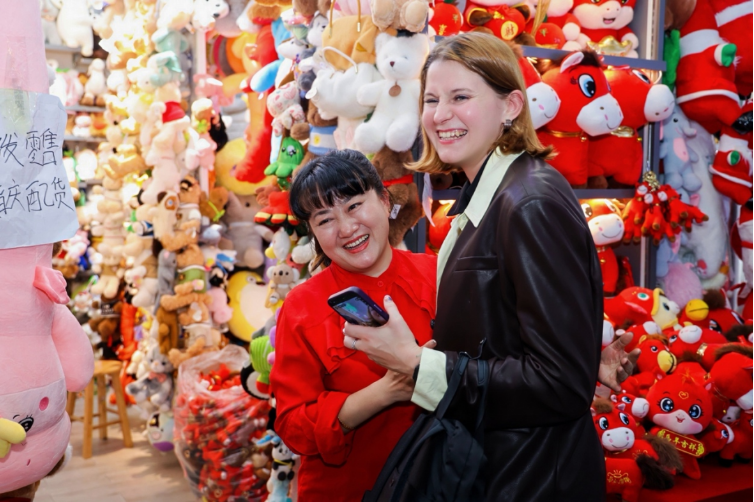 国际创客与“哭哭马”店铺老板娘交流