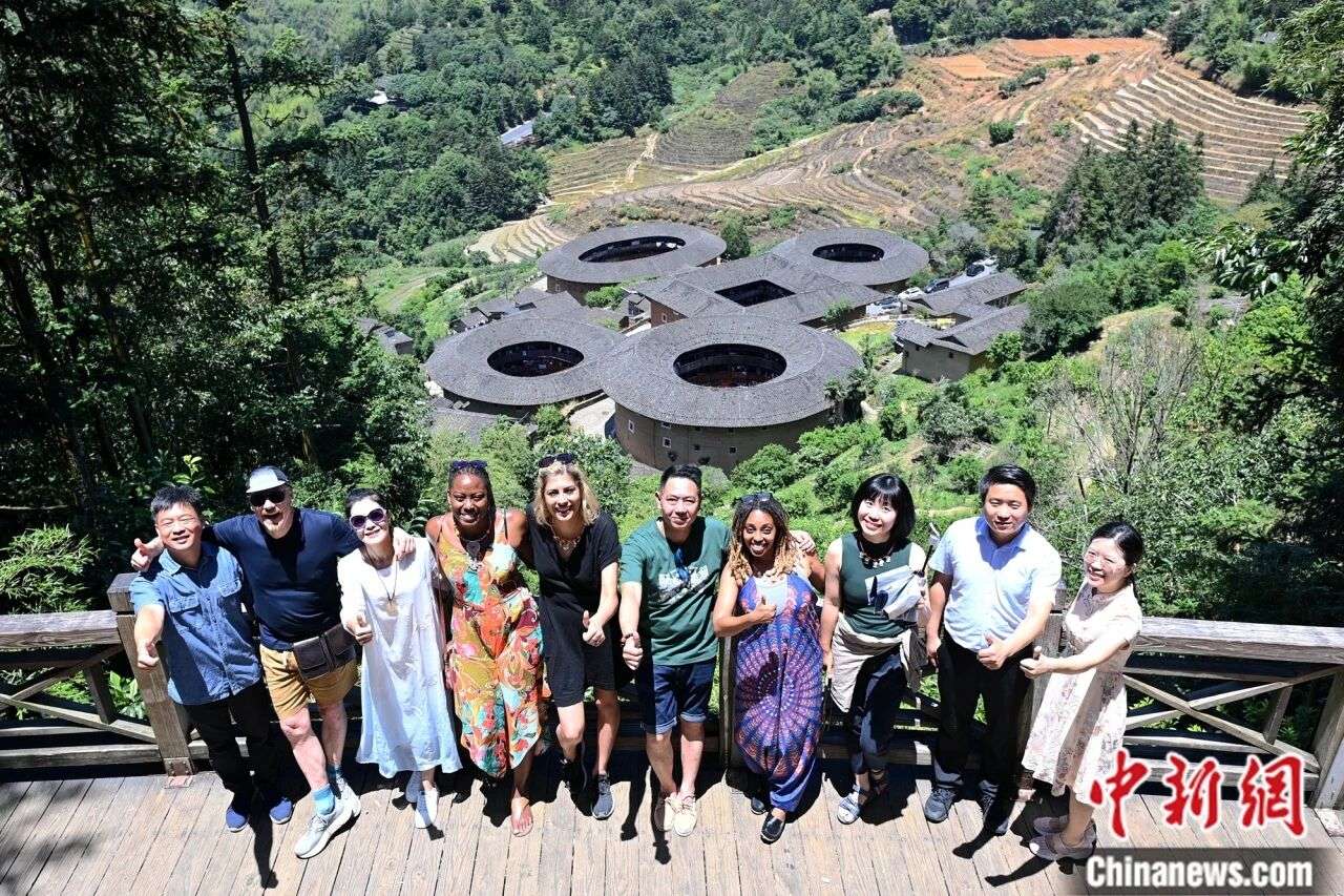 2023年5月29日,美国艺术家代表团成员参访漳州市南靖县,体验土楼文化。中新社记者 张金川 摄